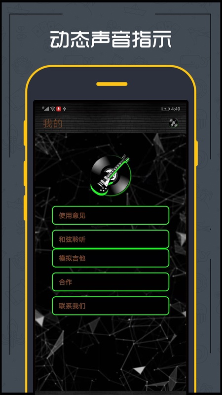 此外,在嘈杂环境下可使用,有背景消噪技术;由吉他手设计,世界领先的音频工程师开发,方便吉他手使用;能改进和弦、即兴演奏、记谱子和听力技能,提高学习速度;有不同琴头视觉效果,可在设置中改变调音应用的视觉效果。