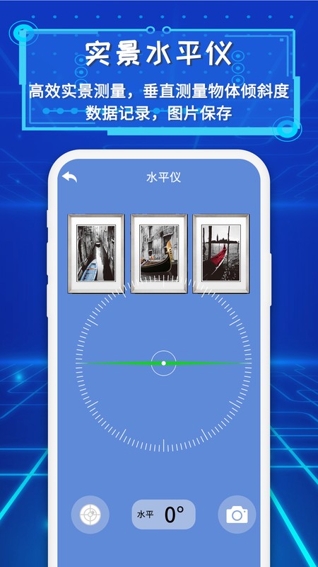 10. 水平仪功能:手机秒变水平仪,支持垂直角度和水平角度实时呈现,旋转角度精度支持至0.1°,处于水平状态时手机以振动提示,主界面呈现亮色。