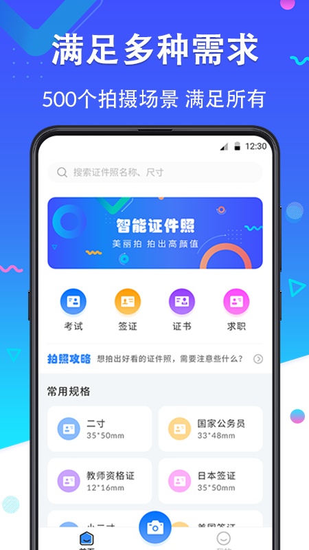 一款用手机相机制作专业证件照的软件!软件的特点是美颜清新,淡处理,证件照尺寸齐全专业化。目前有常用的一寸证件照、二寸证件照,还有全国四六级考试证件照,计算机等级考试、教师资格证考试,各国签证证件照,电子身份证、军人证件照、结婚证件照、公务员考试、求职找工作简历证件照等,612种不同尺寸的证件照,随时随地实现智能证件照随拍!