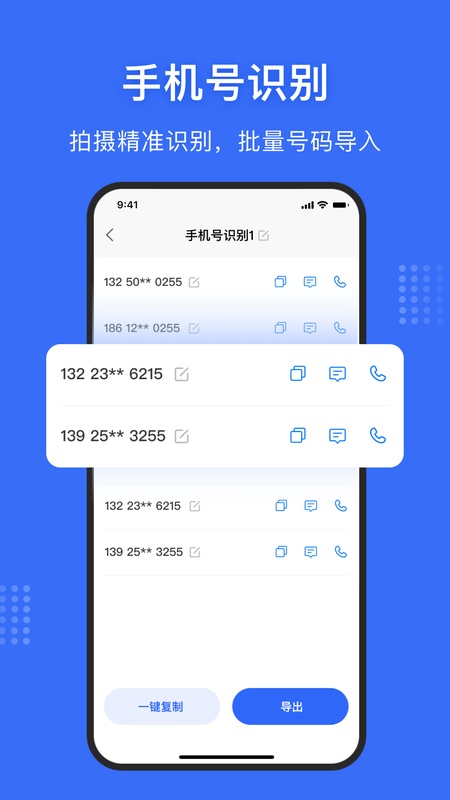 提供号码快速识别功能,快速拍照或本地导入即可一键识别手机号码。