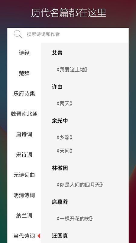 1、精选了古诗词和当代诗歌中经典的诗词名篇上千首