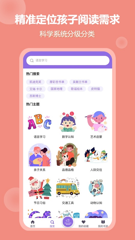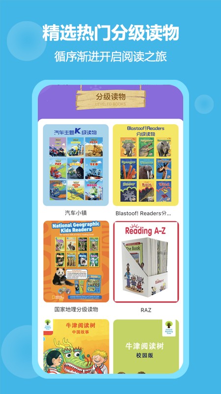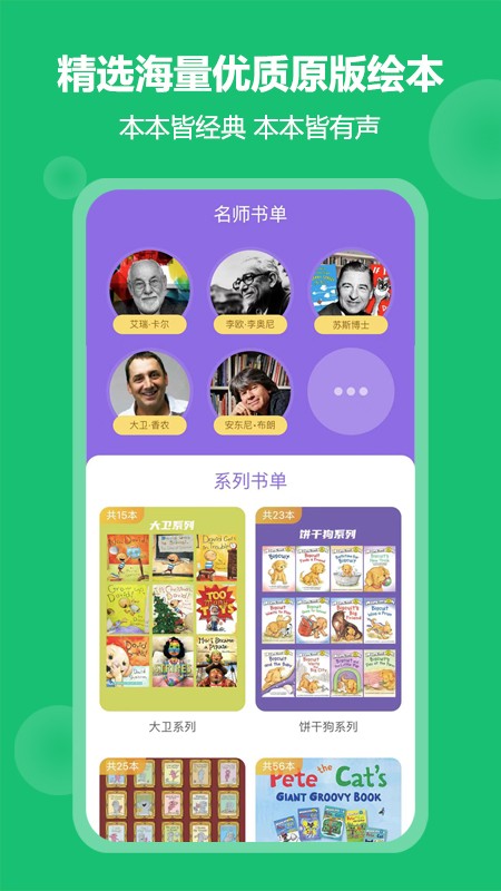 围绕英语启蒙的“听和读”,提供儿歌童谣、经典绘本、名师书单和分级读物等资源。