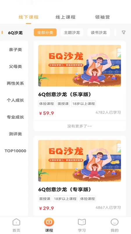 6Q超级爸妈是多品类家庭教育平台,主营业务横跨个人发展、人才测评、婚姻家庭、亲子教育等板块,提供线上线下课程服务,助力用户提升情商、沟通等能力,是掌上家庭教育宝典,致力于中国人才强国战略的人才开发者。 软件特点