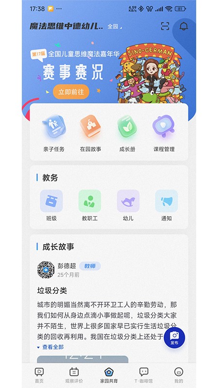 对于家长而言,该软件可以方便地记录孩子成长过程中的点点滴滴,无论是家庭生活中的温馨瞬间,还是园所学习的精彩时刻都能轻松留存。海量的故事绘本和音频儿歌能为孩子提供丰富的学习和娱乐资源。而对于园所老师来说,完整的成长类知识服务有助于更好地开展教学工作。一人上传全家人共享的模式,让家庭成员都能及时了解孩子的成长动态,增进家庭间的交流与互动。