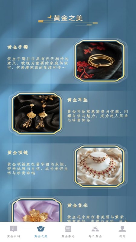 万两黄金,是一款集黄金知识普及与图片鉴赏于一体的优质应用。在这里您可以浏览黄金百科知识,了解黄金首饰的多重意义;还可以学习黄金的保养、鉴定等相关小知识,软件内有丰富的故事和图片等您发现。无论你是黄金收藏爱好者,还是投资新手,都能在这里找到实用信息与审美灵感。立即下载,开启黄金魅力之旅! 应用功能