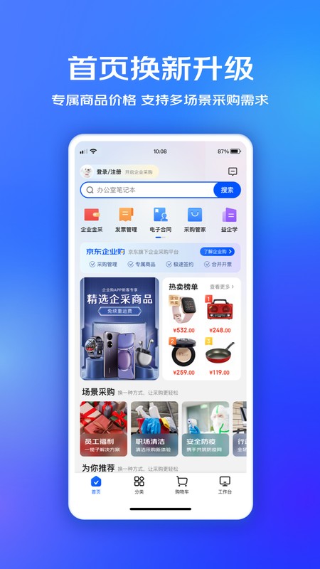 京东企业购专业版是京东为企业提供的数字化采购服务及标准化采购解决方案的一站式平台。依托京东商品及供应链资源,通过专属商品价格、采购流程管理、统一结算开票、采购数据分析、专属采购管家等专业服务能力,助力企业采购线上化、数字化、智能化升级,降低成本,提升效率。 功能特色