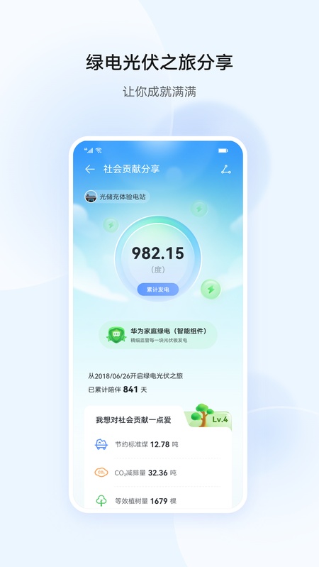 对外展示:微信分享,可向朋友、社交圈分享华为智能光伏之旅,展示对社会和环境的贡献(此功能只面向业主开放)。