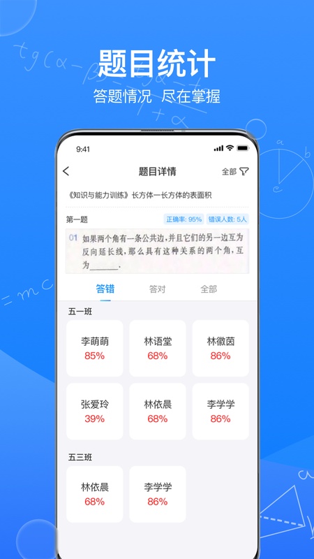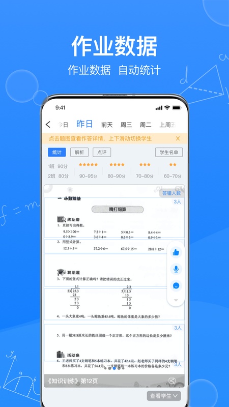 无论是学生端的作业数据还是教师端批改的作业,都是基于拍摄的线下纸质作业照片,老师无须布置在线作业,学生也无须在线答题,即可获得作业的数据统计和分析。