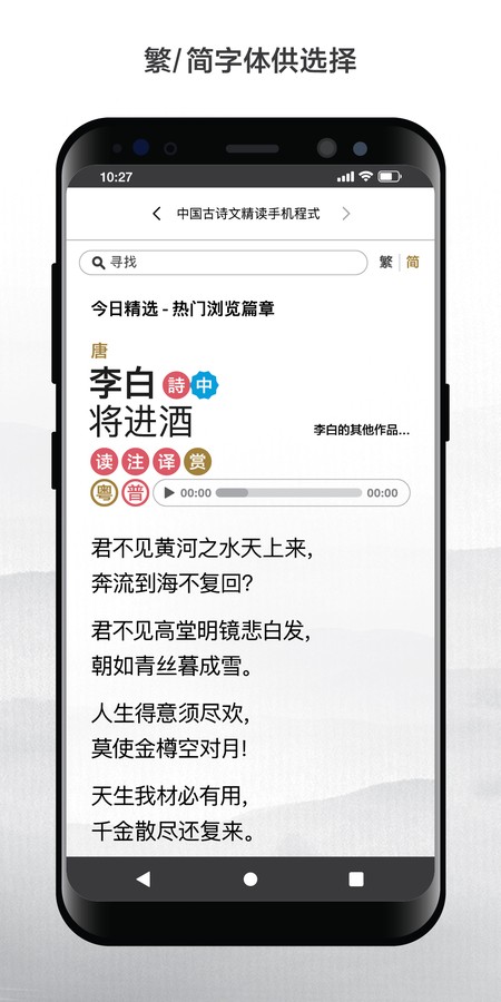精选350篇古诗文,配以朗读(普/粤),注释,译文,导赏,创作背景,作者介绍,繁/简字体,部分作品提供英译。由先秦至晚清,从不同体裁:诗经,古诗,诸子百家,楚辞,辞赋,唐宋古文,唐诗,宋词,元曲及小说等,筛选中华文化历代最重要的资产。
