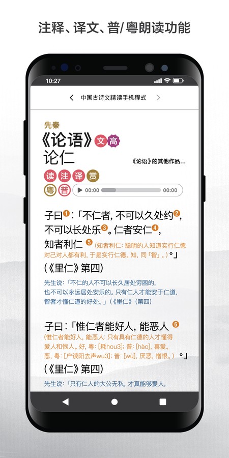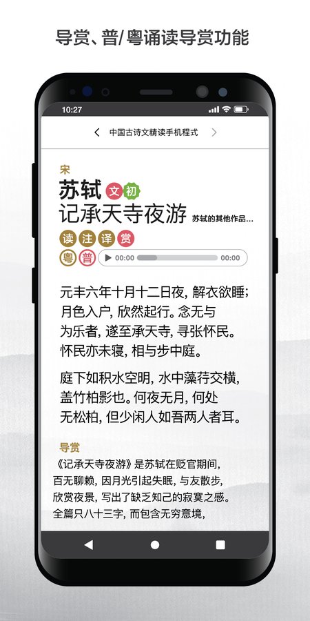 每篇古诗文配以朗读,支持普通话和粤语两种语音,方便不同地区用户学习。