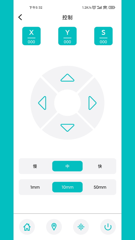 首页左上角的连接按钮可以输入雕刻机的IP地址或在局域网内扫描雕刻机。上部显示屏显示机器当前的 X/Y 坐标和激光强度。底部有四个大按钮,可以进入对应的子菜单: