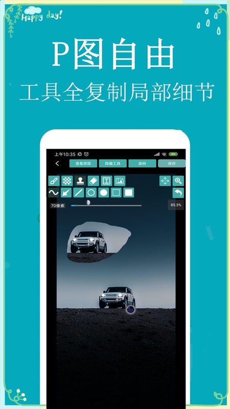 照片马赛克:图库中选择照片进行处理,手指涂抹的区域马上就变成了马赛克。保护自己的隐私不被窥探!