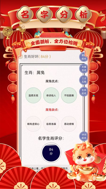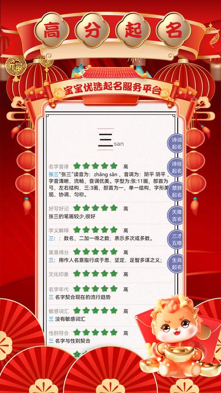 软件提供上万个免费吉名推荐,还有专属高级定制款,可让富贵吉名常伴一生。测名时结合生辰信息,能多维度深入解说名字释义。