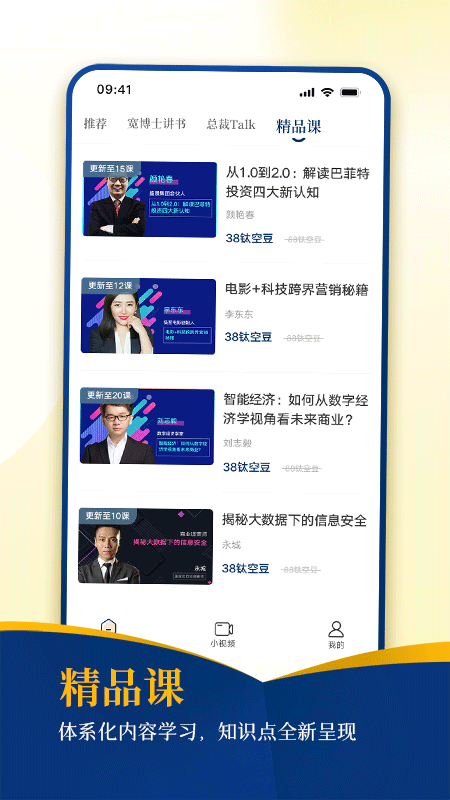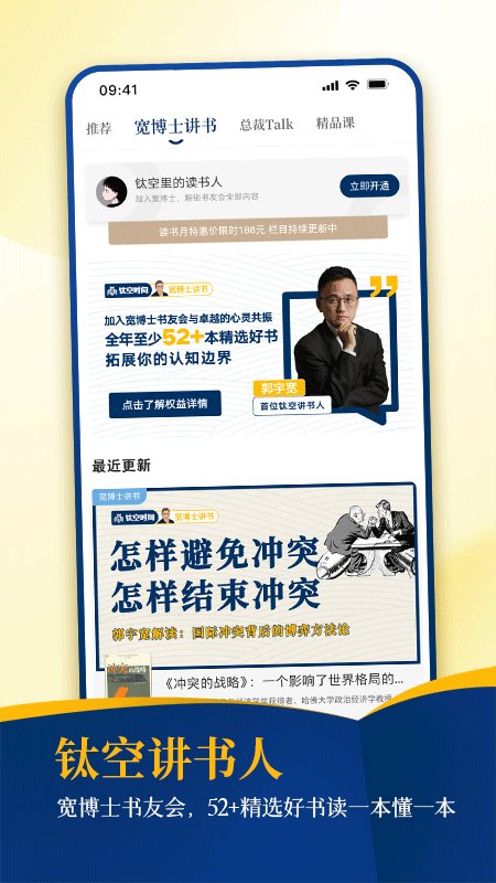 该App是钛媒体集团旗下专注于泛财经与商业知识服务的音视频App,为商务人士打造,适合利用碎片化时间进行系统性学习。上线首推首位“钛空讲书人”郭宇宽博士,打造【宽博士讲书】 +【宽博士书友会】,全年至少52+本经典好书,1小时吸收1本书的精华,还有精选书单,用户可享受思维碰撞,进行线上线下对谈,与宽博士、陈志武等思想大咖实时互动。“总裁Talk”能让用户“见证”关键节点亲历总裁决策心路。“精品课”可让用户领略多样化思维,获取更多启发,用碎片化时间获取高浓度知识。