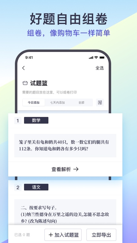 独特的“试题篮”组卷功能,如同购物车一样使用简单。