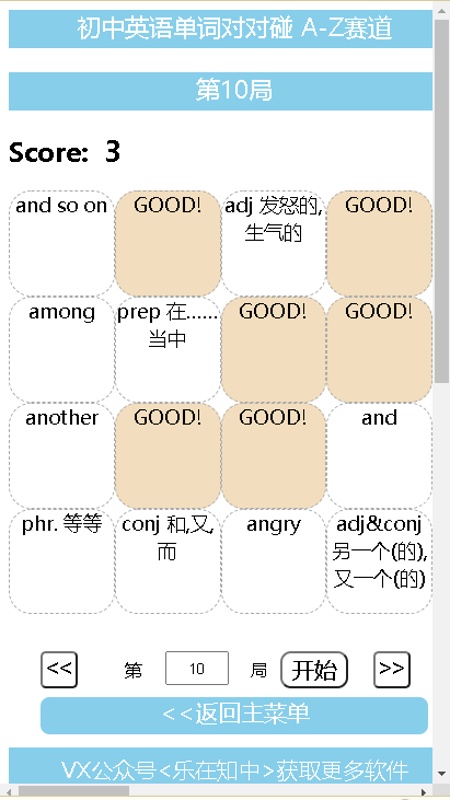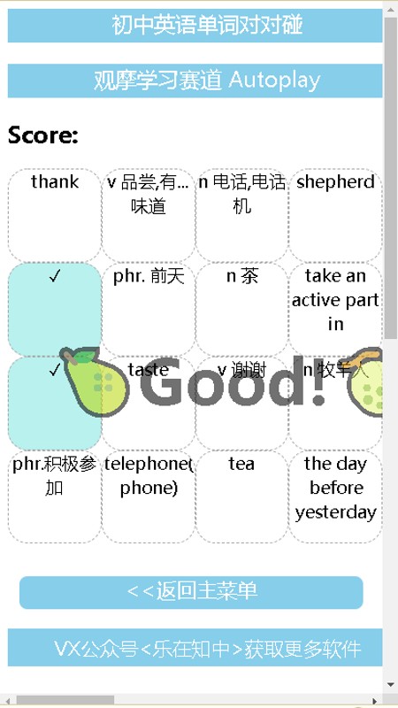 1.初中英语单词对对碰提供了78条单词记忆练习赛道,包括: