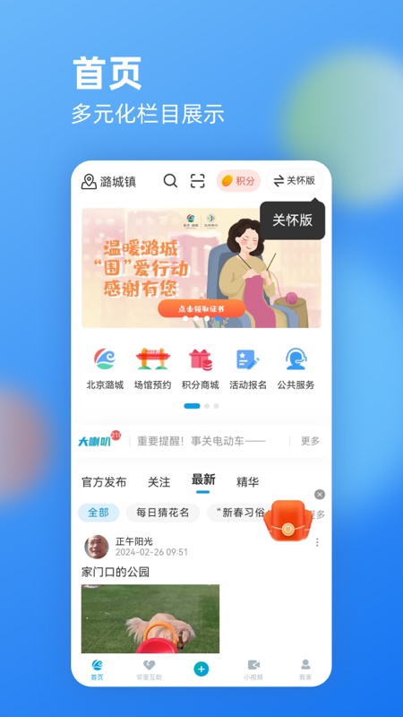 集多种功能于一体,满足居民社交、办事、了解资讯、参与活动等多方面需求。