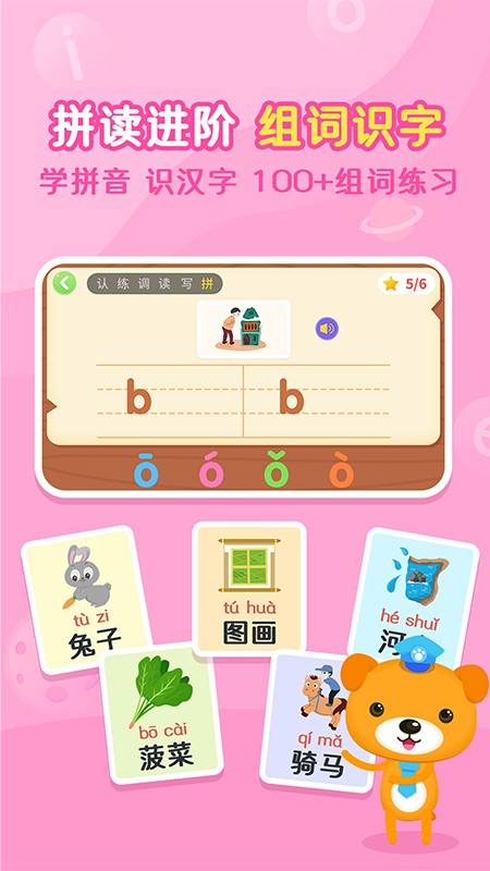 学习体系科学,包含认、练、调、读、写、拼六大拼音学习模块,音拼读规律由浅入深、循序渐进,结合练习游戏,打造互动式学习,及一课多练巩固学习成果的方式,让孩子在玩中快乐学。