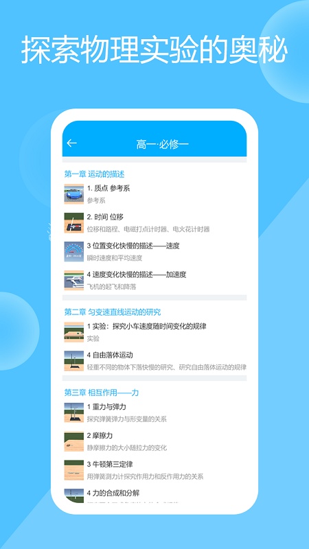 高中物理实验是一款供高中部师生进行实验演练的3D软件。它高度复现了高中物理课本中的实验场景,让知识的学习更加直观和方便。实验中有不同情景下的操作演示、原理说明和器材结构等,用户既可以根据课本来学习实验,也可以根据实验来梳理课本知识。本软件制作的目的只有一个:让知识不再抽象,为学习提供方便。 App功能