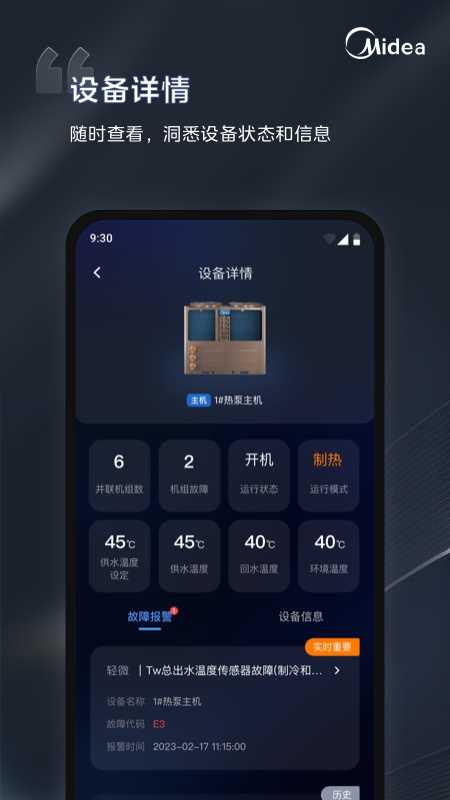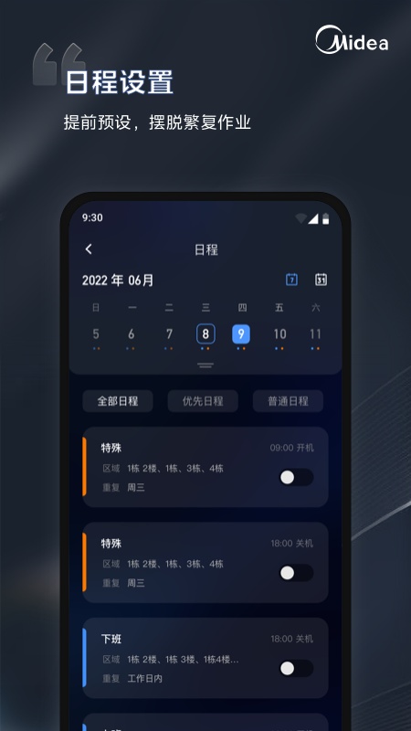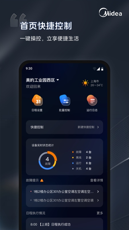 i管家由美的智慧楼宇科技 iBUILDING 出品,服务商用中央空调用户。它提供设备实时监测,能直观查看每个设备的实时运行状态、故障信息等情况;支持设备云端控制,可远程控制设备的启停、温度、模式、风速等,还能进行批量集控,并且支持将个性化设置作为快捷操作;具备日程设置功能,可将周期性场景设为日程,i 管家会按设定自动下发指令控制设备;有一键报修功能,可便捷报修故障,还能实时跟踪服务进度。此外,它支持管理多联机、大型水机、商用热泵等多种类型的商用空调,能按项目、按设备组多维度管理设备,用户可随时随地精细化进行设备管理操作。
