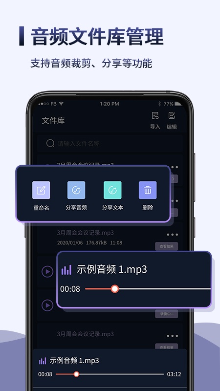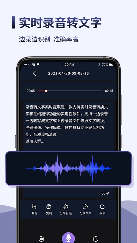 该软件支持实时录音和录音转文字,能将录音后内容转写成文字,也可导入外部语音文件转换成文字,转换准确迅速,操作简单。转换后的文字支持编辑、复制、分享以及多种文档格式导出。它可一边录音一边转写成文字,或上传录音文件进行文字转换,能满足日常工作中语音转换文字、文字提取、语文听写、语音附加等各种需求。