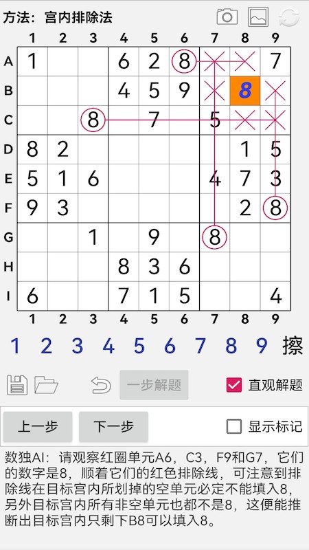 直观解题功能基于人类思维解法,对初中级难度数独题逐步解题,常用宫内排除法等多种方法,助初学者入门进阶。