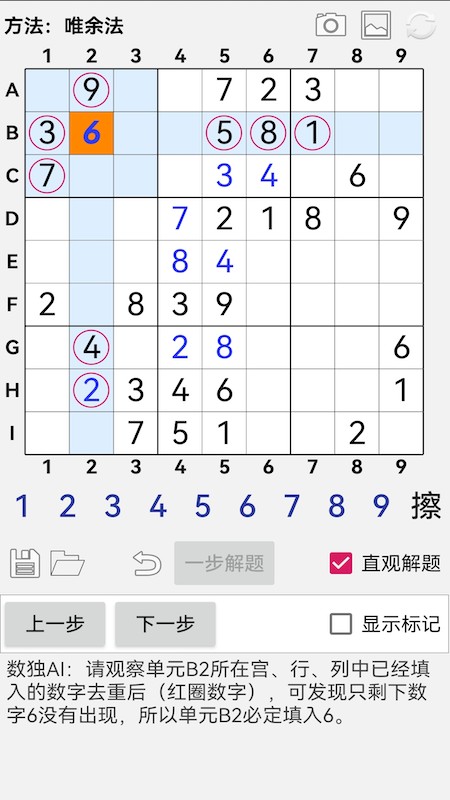 需要解题时,可使用一步解题功能快速得出结果并判断是否唯一解;对于初中级难度题目,可用直观解题功能学习解题方法。
