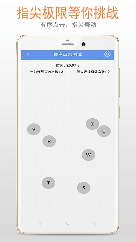 5、顺序点击测试,英文字母随机位置出现,按照字母表顺序点击,支持连击次数的展示,相关数据实时展现;
