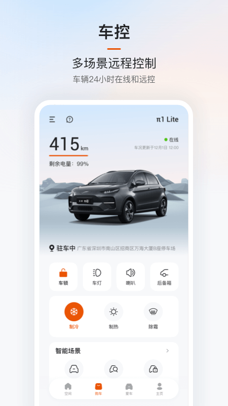 1、远程控车:可使用 APP 解锁车门、打开空调、打开车灯、一键寻车、实时显示车辆状态及位置。