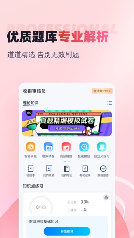 收银审核员题库内含考点练习,全国通用卷以及地区卷模拟练习,以及按照固定考试比重的随机式的抽题的真题考场,成绩单实时记录考试数据,一点一滴的反馈考生近期学习状态以及自我正确率的提升,大大的给予考生通过考试的信心。 功能特色