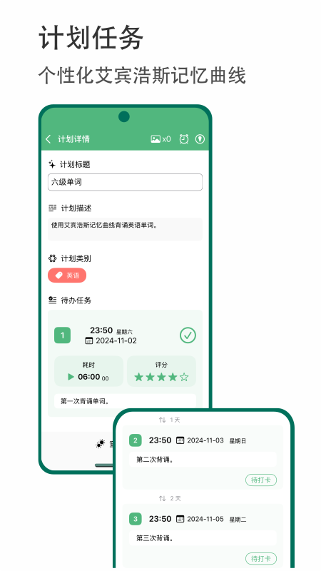 计划任务方面,可自动生成艾宾浩斯计划并按时提醒,支持上传图片、批注打分;也能自定义计划,支持个性设计频率周期,批量生成任务和计划;有组件打卡、多维度检索、复制计划等功能,专注高效,化繁为简。