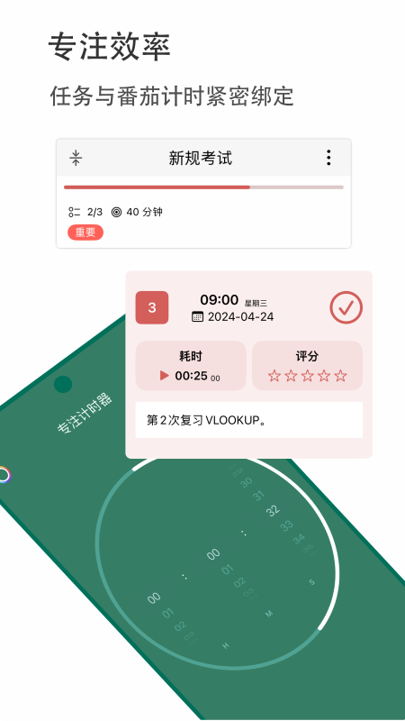 专注效率功能可将专注计时与任务执行绑定,助力提升工作学习效率。此外,还有重要日、习惯打卡、生理期、桌面小部件等贴心使用工具。