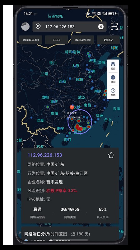 该软件可掌握当前连接或查询的IP的运营商、网络类型(如4G、宽带、企业专线、数据中心等)、连接网络的设备类型和路由器类型等信息。在查询单个或多个IP地址时,能在地图中展示这些IP的地理覆盖范围以及流量使用情况。还能展示IP按小时或者星期的流量使用潮汐,呈现流量使用的高峰时段规律。利用大数据和人工智能算法,综合分析IP的各种属性,以及此IP所产生的流量是否存在作弊、攻击等行为,实现所查询IP的风险预警提示。