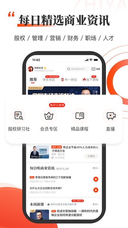 知呀——中国企业在线学习平台。每年围绕12个企业经营管理主题,学习52堂商业实战课,通过系统学习,持续提升企业经营管理能力。 应用功能