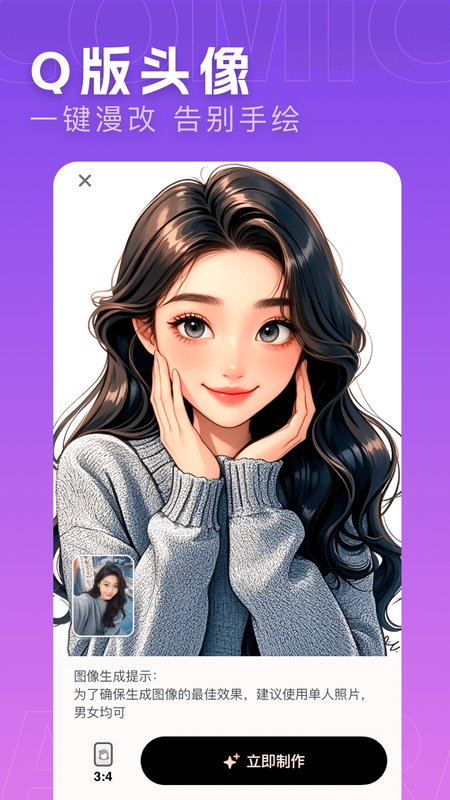 能让照片跃然纸上,变身卡通明星,带来独特魅力,让生活充满惊喜。其创意无限,风格多元,涵盖了从卡通到国潮、从3D到手绘等各种风格,满足不同用户的创意需求。热门特效一网打尽,让用户的照片闪耀众人眼球,释放创意,展现真我。
