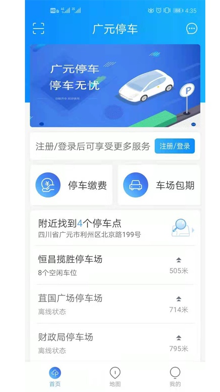 打开广元停车APP,在首页可以直接进行周边停车场车位查询。当找到合适的停车场并停车后,在缴费时选择手机支付功能完成停车费的缴纳。如果在停车场内需要找车位,通过APP的相关指引即可快速定位。