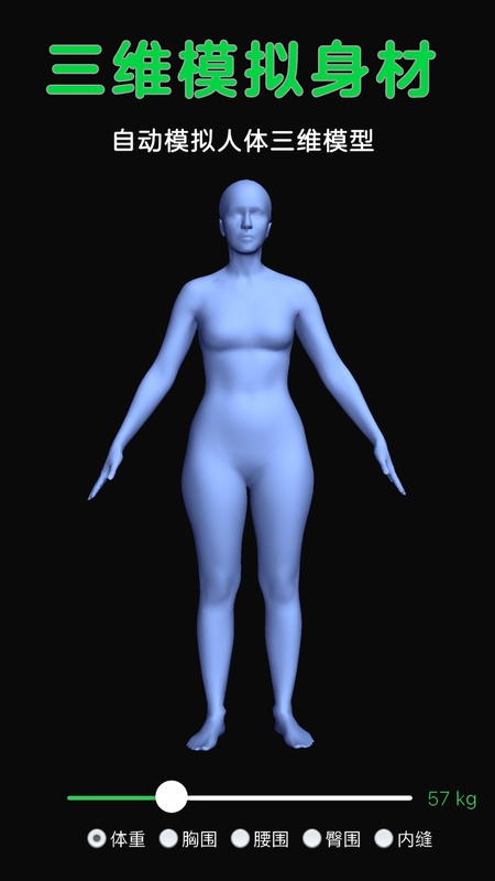 根据扫一扫测身材的人体数据,软件自动模拟人体三维模型,也可以自己编辑身材,比如:体重、胸围、腰围、臀围、内缝,编辑出自己想要的理想身材,为打造完美身材作为依据。