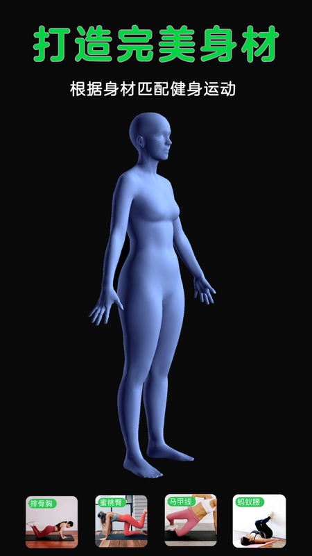 该软件具备多种实用功能。「扫一扫测身材」功能,只需用手机扫一扫或上传一张自拍全身正面照片,软件就能计算身材,并依据国际身材标准将身材分为倒三角、正三角、长方形、苹果型、菱形和沙漏形。「三维模拟身材」可根据扫一扫得到的人体数据自动模拟人体三维模型,用户还能自行编辑体重、胸围、腰围、臀围、内缝等,打造理想身材。「打造完美身材」在模拟完身材后,用户选择目标身材,软件会依据当前身材类型和三维人体模型,计算出需强化运动的部位,助力完成瘦身计划。「雕刻全身曲线」则按身体部位分类,如天鹅颈、直角肩等,几乎涵盖全身,且运动均可在家完成。