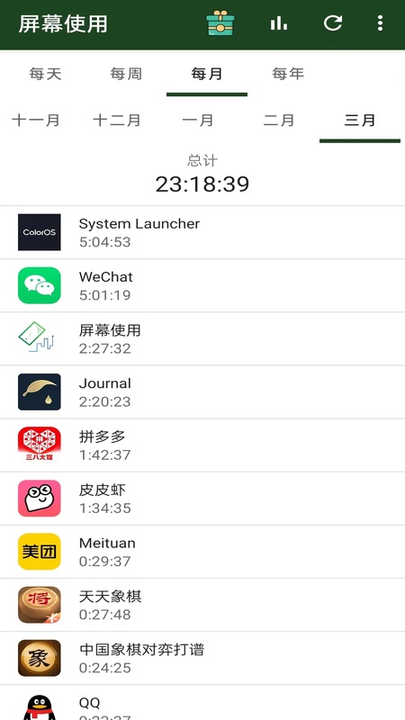 支持按天、按周、按月、按年来总的查看使用手机的时间,为用户提供全面的时间统计维度。