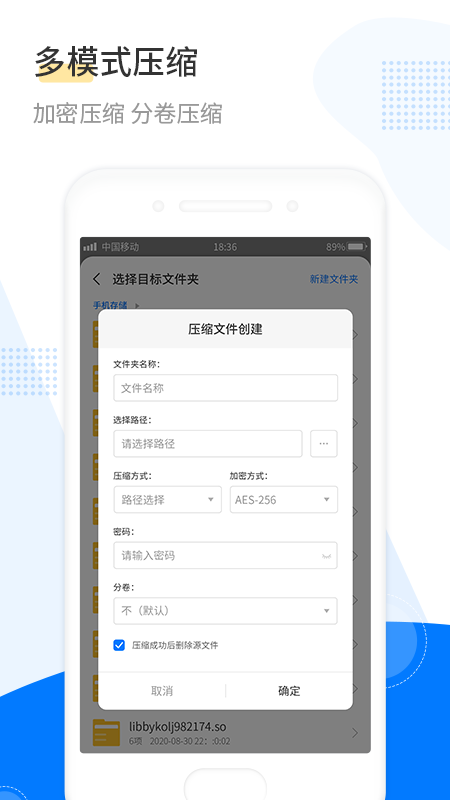 【解压缩全能王】多模式压缩:压缩文件支持多种格式多种压缩模式,并且还支持分卷压缩,加密压缩,密码解压等等;