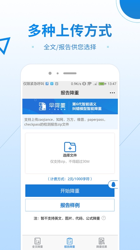 用户将需要降重的毕业论文上传至早降重论文降重系统,系统便会利用第5代语义纠错模型对论文进行处理,一键完成降重。