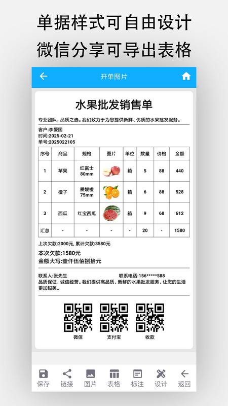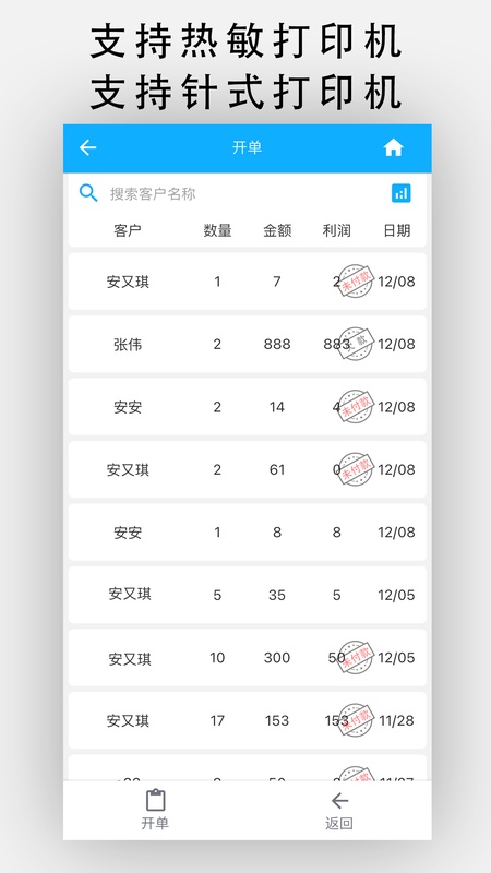 开单可直接打印出小票,并且可通过微信进行分享,也可导出表格。