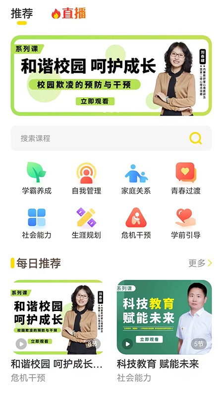 和启家教,是一款面向家长的家庭教育产品。通过多维度的知识内容,帮助家长正确理解家庭教育的理念、知识,并掌握实际操作的方法。所有功能分布于首页、直播、校园频道、我的客服、我的等模块。和启教育以家长和孩子幸福成长为核心,专注于用爱与科技提升家庭幸福,帮助家长与孩子在一个幸福的家庭教育环境中一起快乐成长。 软件功能