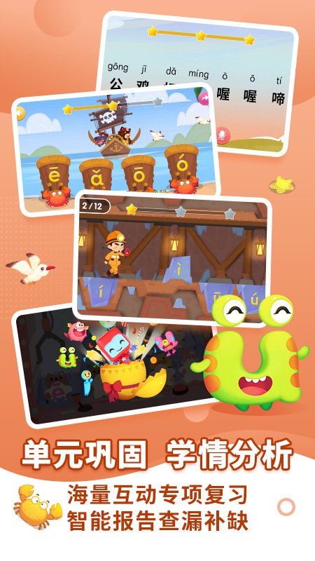 采用沉浸式互动课程,情景式拼音教学设置多个主题场景,如城市、乡间、海洋等,让拼音学习变得有趣。课程体系科学,通过认、读、写、调、玩五大环节学习拼音。
