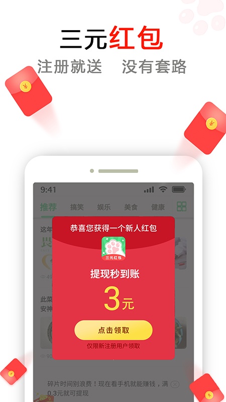首次登录懒猫赚钱可获得3元现金红包,随时可提现。