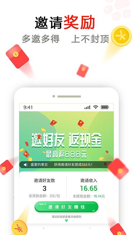 提现门槛低,每天3元起即可提现,且有多种提现方式,能快速到账。邀请好友奖励丰厚,邀请一个可轻松赚8元。首次登录有3元现金红包可随时提现。用户在阅读过程中就能获取收益,相当于利用空闲时间做小兼职。