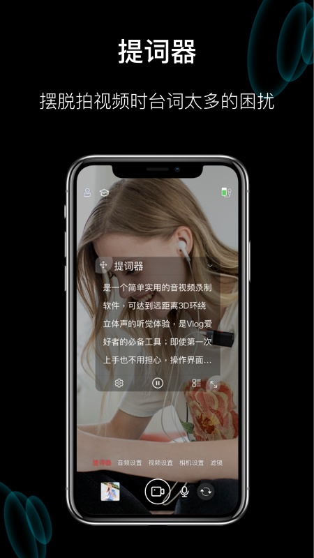 拥有AI自动添加字幕、超越播音员直播效果的提词器、大片质感的多场景滤镜、高分辨率的视频输出和分享等功能。
