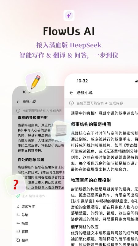 - 写作助手:FlowUs AI 提供写作灵感,帮你润色、总结、翻译,助力内容创作