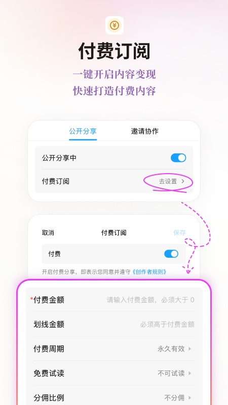- 付费订阅功能,帮助你快速打造付费内容,将你的图文、音频、视频即刻变现
