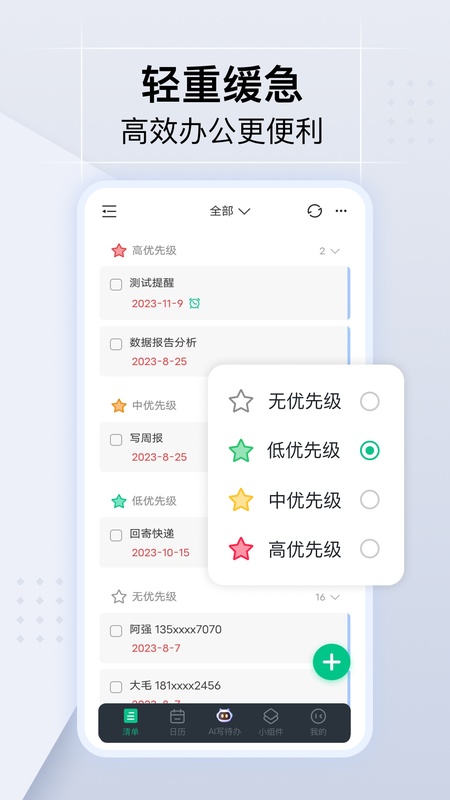 - 优先急缓:支持为待办事项标注优先级,让自己更加专注。